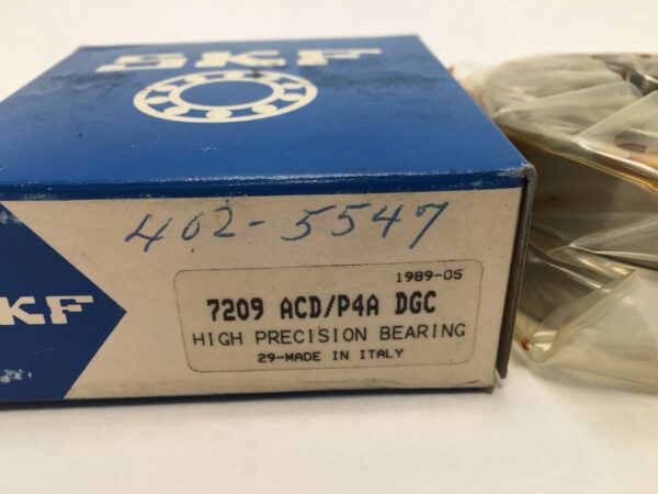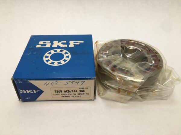 The product is a set of two SKF 7209-ACD/P4A-DGC Angular Contact Ball Bearings. These bearings have a bore diameter of 45 mm, an outside diameter of 85 mm, and a width of 19 mm. Made of steel and manufactured in Italy, these bearings are designed for high precision and performance in industrial automation and motion control applications. The model numbers include 7209ACD/P4A DGC, 3MM209WI CR DUH, 7209 E T DUH P4, and 7209 A5.