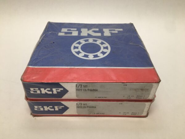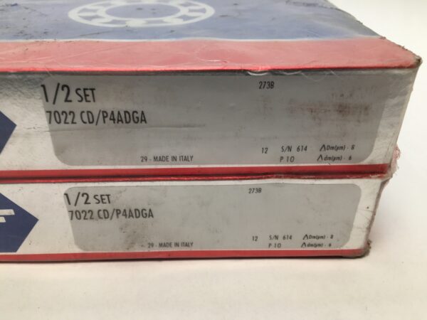 The product is an Angular Contact Ball Bearing manufactured by SKF in Italy. This specific bearing model is 7022CD/P4A DGA, with a bore diameter of 110 mm, outside diameter of 170 mm, and width of 28 mm. Made of steel, this bearing is designed for industrial automation and motion control applications, offering high precision and reliability for mechanical power transmission systems.