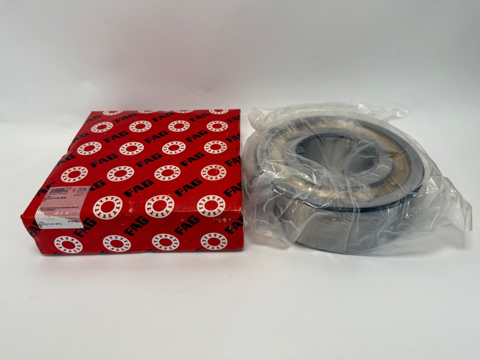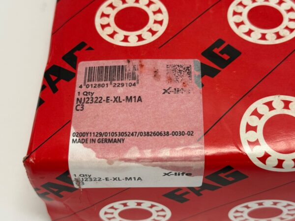 The product is a FAG NJ2322-E-XL-M1A-C3 Cylindrical Bearing with a bore diameter of 110mm, outside diameter of 240mm, and width of 80mm. Made of steel and manufactured in Germany, this bearing is designed for industrial automation and motion control applications. As a cylindrical roller bearing, it offers high radial load capacity and is suitable for various mechanical power transmission systems. The FAG brand ensures quality and reliability in this specific bearing model, making it a desirable choice for businesses seeking precision and performance in their machinery.