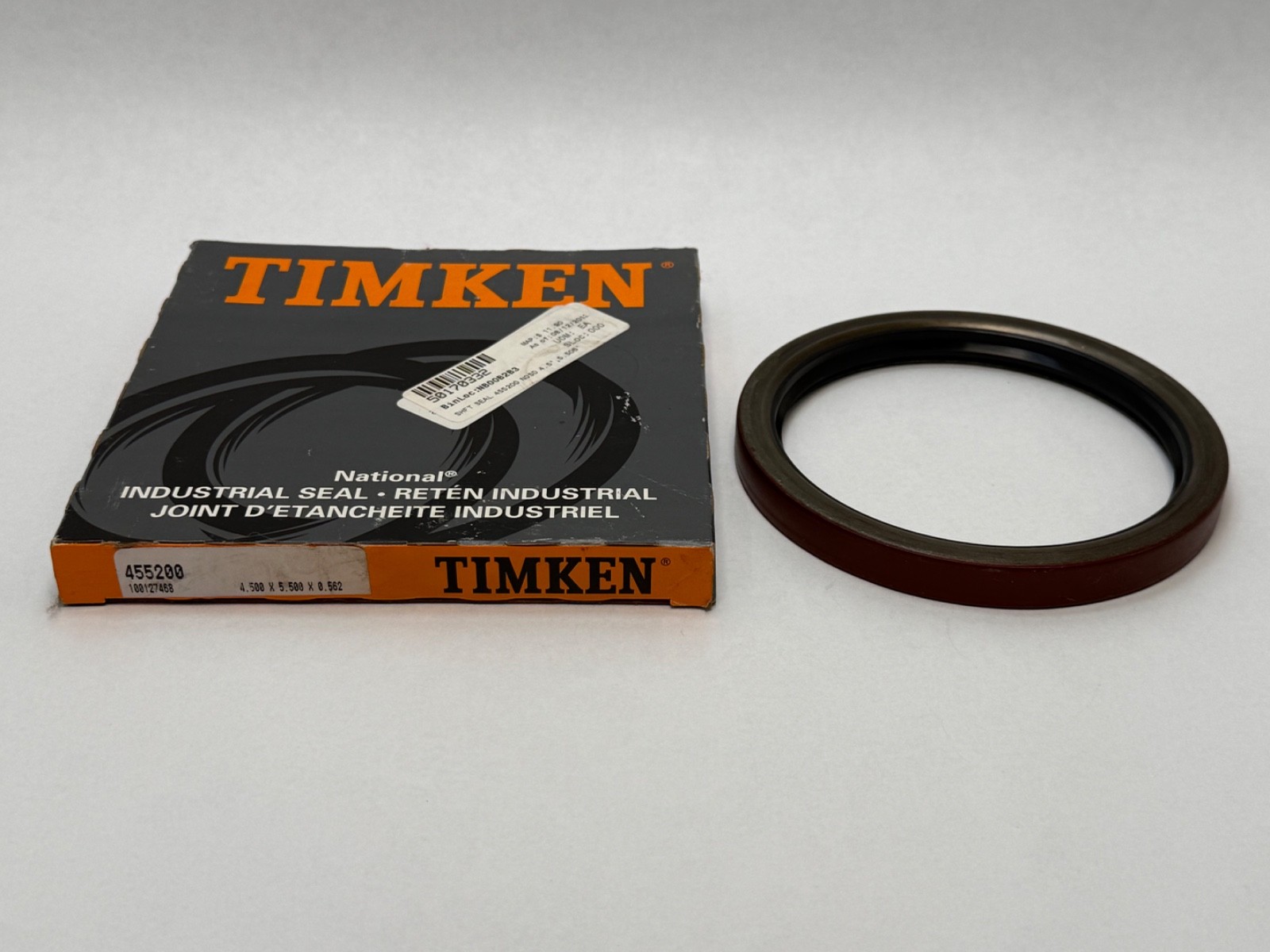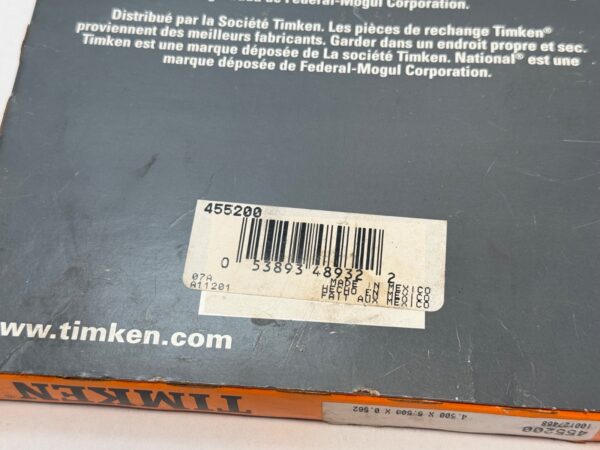 The product is a Timken 455200 oil seal, designed with dimensions of 4.500 x 5.500 x 0.562 inches. Made in Mexico, this industrial automation component is a single unit essential for mechanical power transmission and motion control systems. With a trusted brand like Timken, this oil seal ensures reliable performance and durability in various industrial applications.